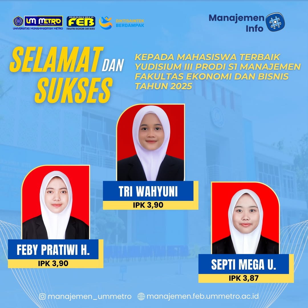 SELAMAT DAN SUKSES KEPADA MAHASISWA TERBAIK YUDISIUM III PRODI S1 MANAJEMEN FEB UM METRO TAHUN 2025